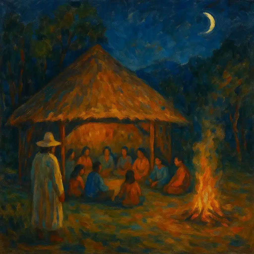 The primary setting for Mambe and Ambil use is the círculo de la palabra (circle of the word). The fundamental purpose is to "sharpen thought and cleanse the spirit to make man harmonize with man and men with Nature and the cosmos"—an intention that resonates deeply with our mission. This ritual functions as an integrated form of "bio-social technology," where pharmacology is harnessed to produce a desired social outcome. It serves multiple functions: governance, education, social healing, and transmission of sacred knowledge. A key protocol is that anyone who introduces a problem must also offer a solution, ensuring dialogue remains constructive. The ultimate goal is achieving palabra perfecta—the "perfect word" of harmonious, truthful, heart-centered communication.